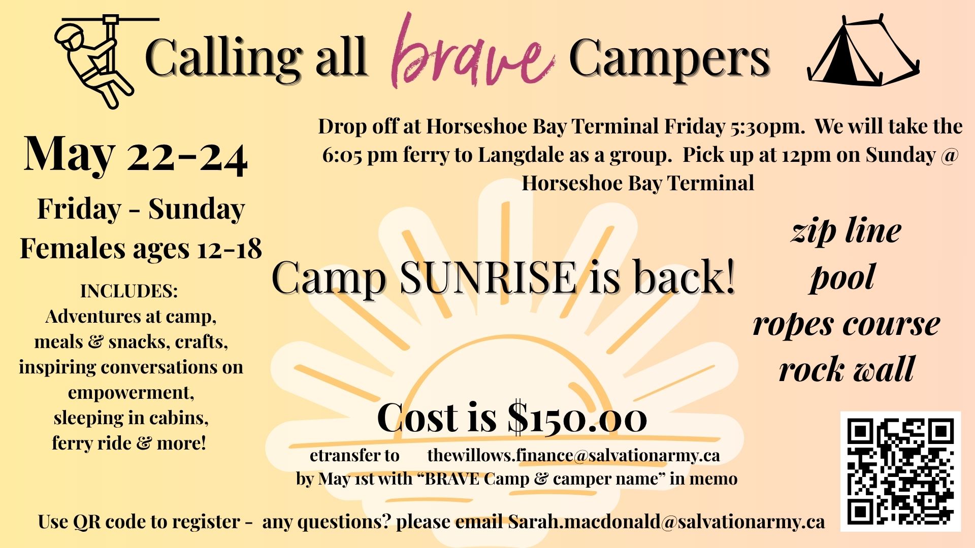 The cost for the weekend is $150, which covers accommodation, meals, ferry transportation, and all camp activities.